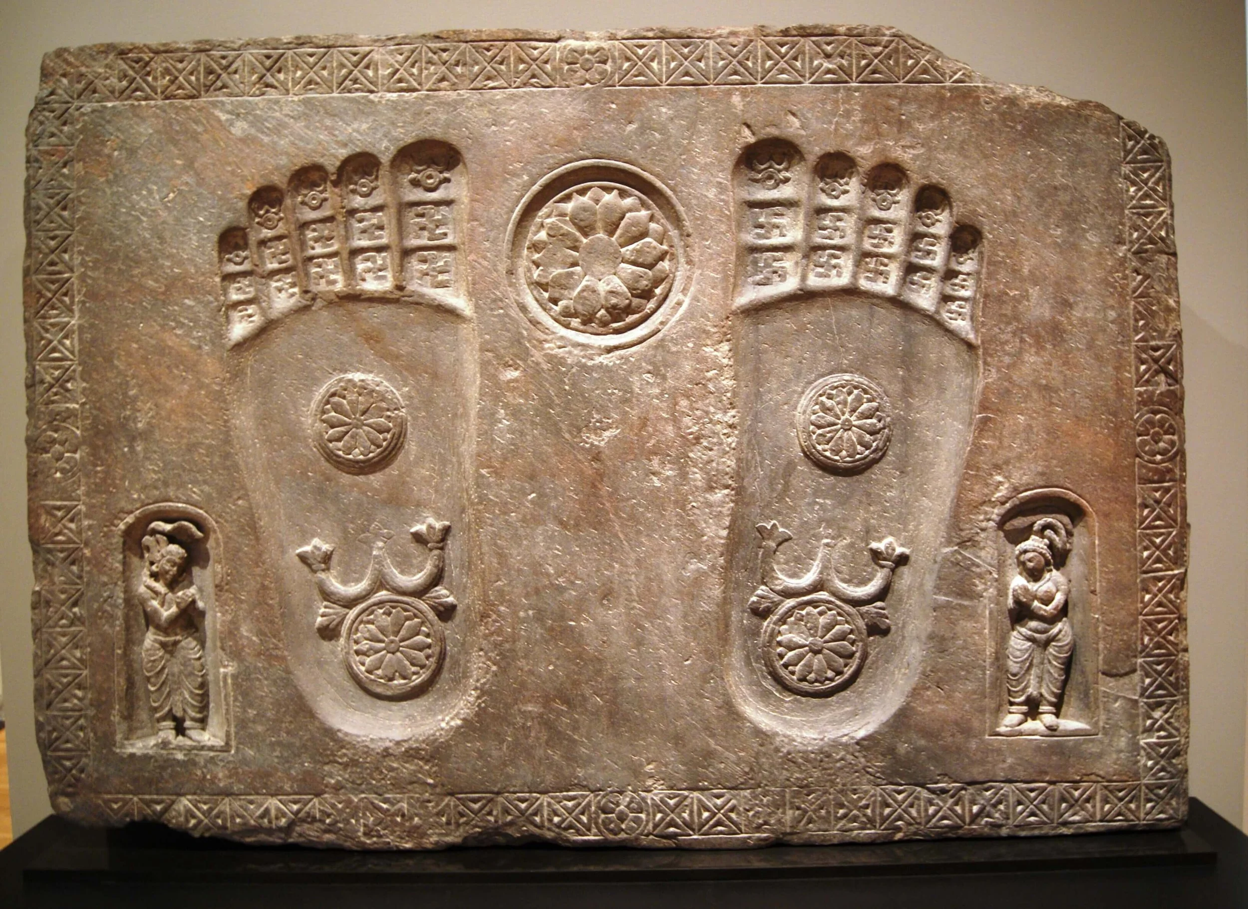 A sculpture from ancient Gandhara, South Asia, depicting the footprints of the Buddha, known in Sanskrit as Buddhapada, 2nd century (Kushan period, c. late 1st – early 4th century C.E.).